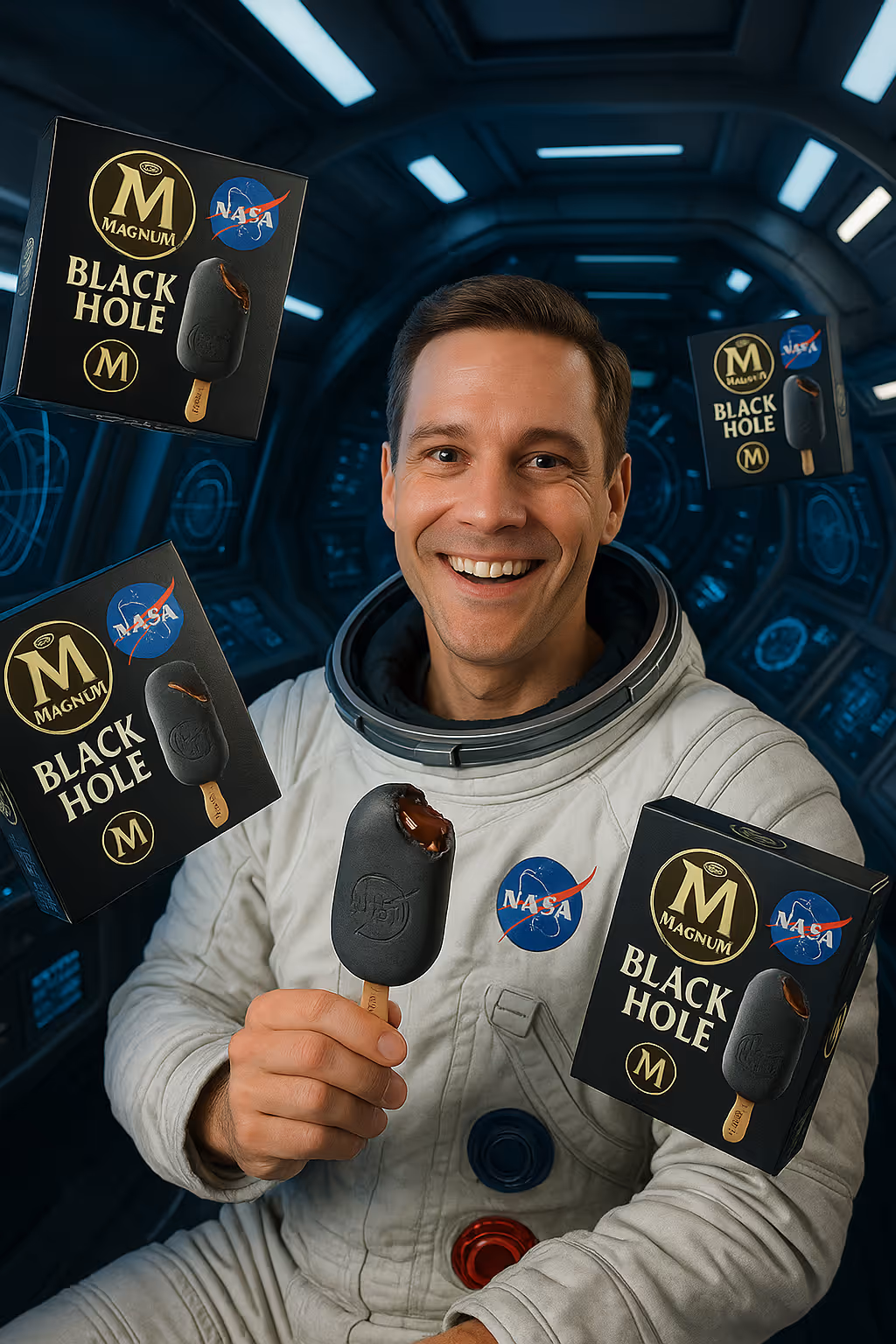 What happens when a heritage ice-cream sticks brand and the world’s most storied space agency chase pleasure at the edge of physics? Magnum × NASA “Black Hole” re-imagines deep-space phenomena as a sensorial treat: a matte-black chocolate shell hiding a molten caramel core that “draws you in.” We developed an irreverent launch campaign that sends astronauts to the corner store, lines freezer doors with swirling singularities, and treats the ISS as a tasting room — all through generative-AI world-building.